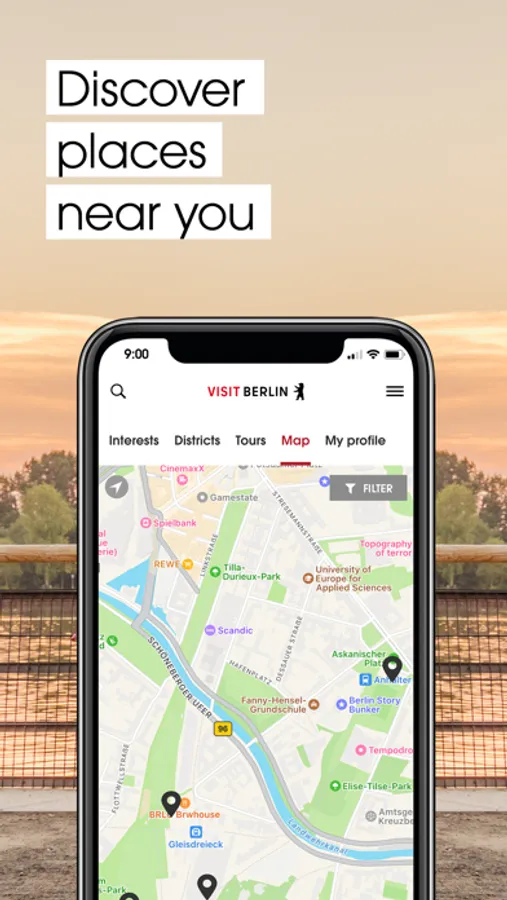 – BERLIN TIPS + INFO on the city’s districts and neighbourhoods. We also let you into the secret of our top personal Berlin tips. Discover our tips for such areas as leisure and sport or art and culture. And of course, we also offer information on specific topics – from fun things to do for free to the nearest green spaces to relax. The app also lets you suggest your own Berlin tips!