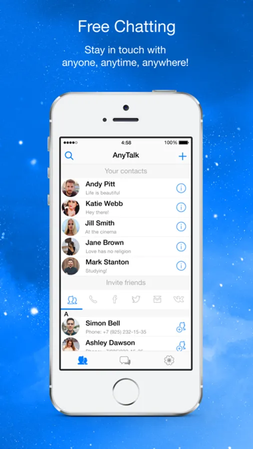 With AnyTalk you can stay in touch with anyone, anytime and anywhere! Freely. You can call or send messages, send photo and video messages as well as voice messages, locations and contacts worldwide over WiFi or 3G. AnyTalk seamlessly syncs across your devices and can be used on phones and tablets.