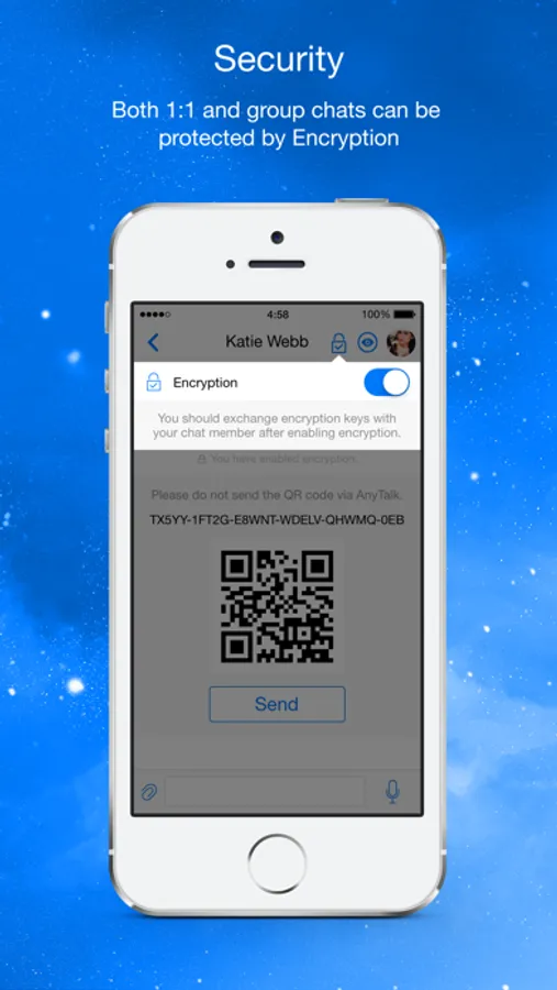 You can enable end-to-end encryption for both new or existing chats. When encryption is enabled, all outgoing messages will be encrypted by special key and only participants who got this key can read conversation. The key generates on device of user who initiate encryption and must be transferred to other chat participant by meeting in person. This way our servers knows nothing about your encryption key, plus you will avoid any possibility of man-in-the-middle attack.