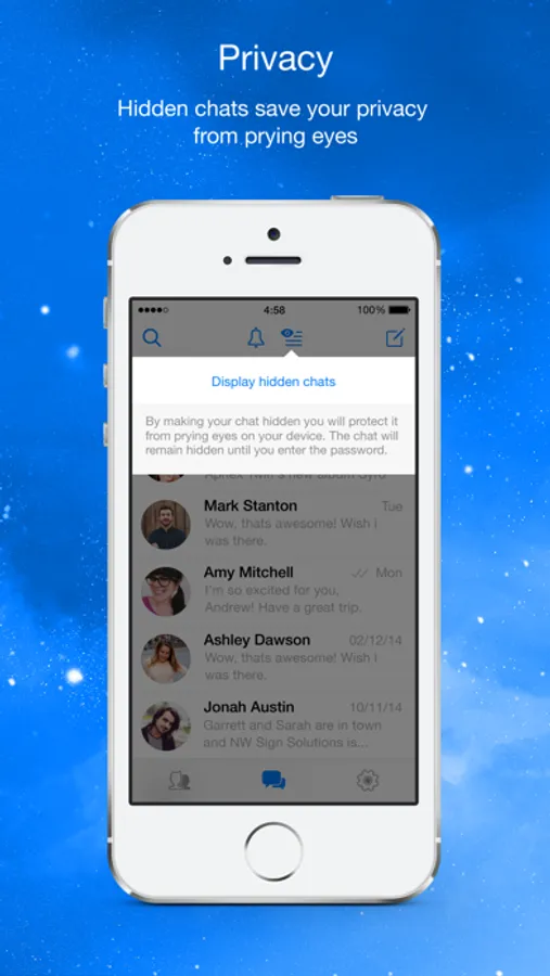 Encrypted chats will help you when it comes to data transfer and secure communication. But if someone get physical access to your mobile device — let’s say your friend, or mother, or girlfriend — we've got you covered with hidden chats! Such chats protected by password you will set and hidden from both chat and contact lists.