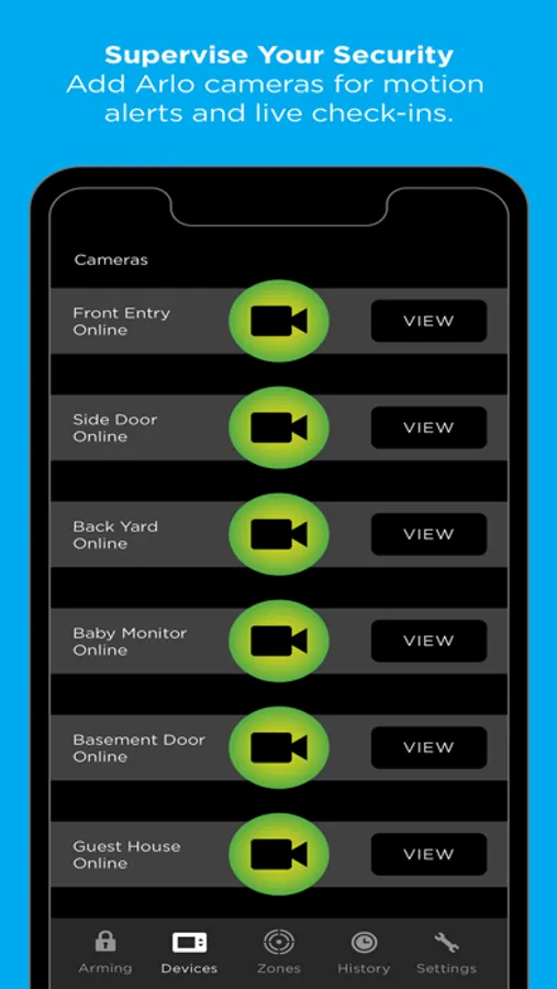 Make the most of your surveillance cameras from Arlo. You can review recorded activity or conduct a live look-in from within the HomeControl Flex app or web version at any time. And, if you have more than one property with HomeControl Flex, you can link them all into one login, allowing you to easily switch between them to monitor your surveillance cameras or arm a security system.