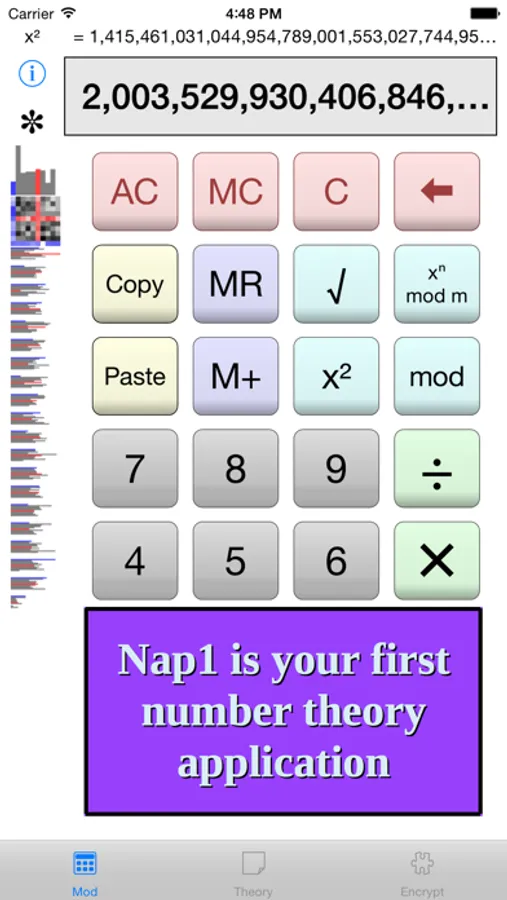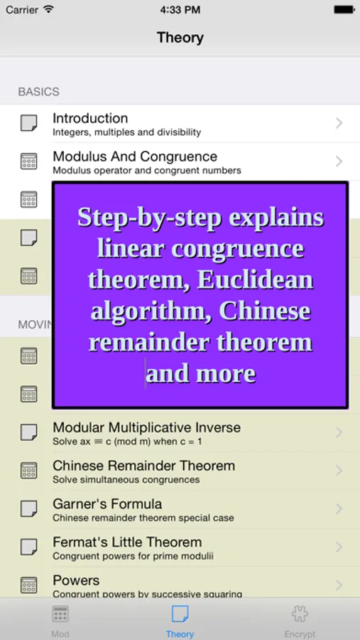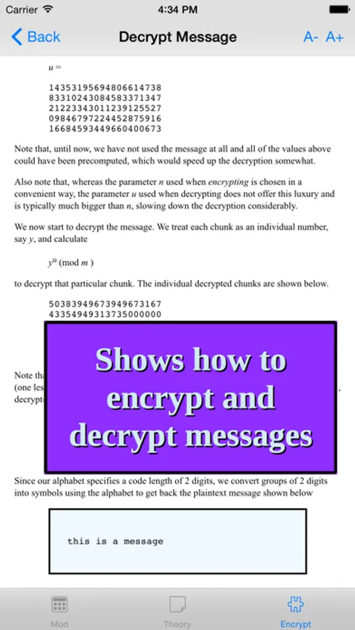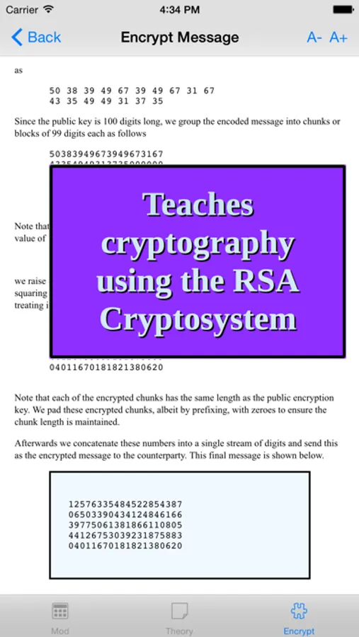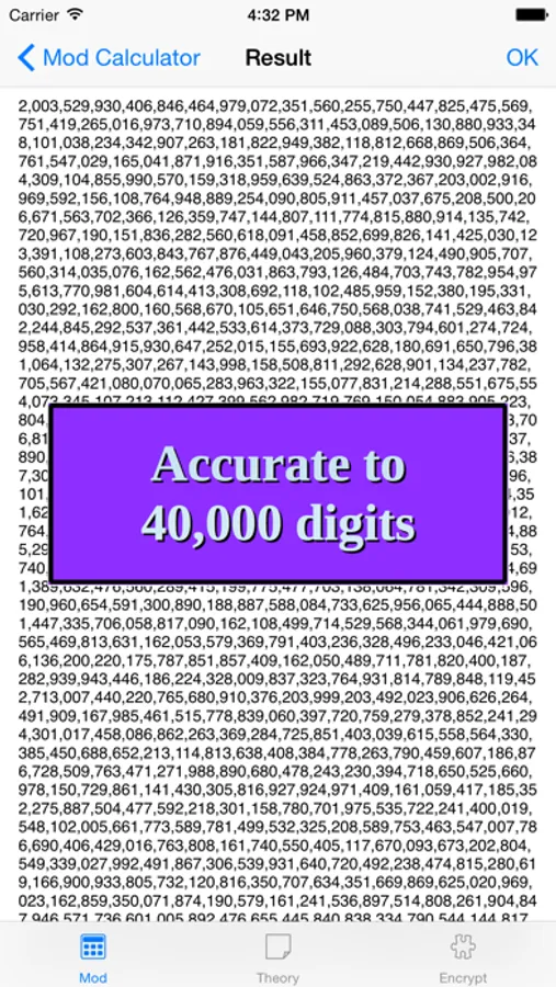 Calculate accurately up to 100,000 digits (40,000 on older devices) using its free arbitrary precision calculator. Then use one of the many special purpose calculators that implements algorithms such as the Euclidean algorithm, linear congruence theorem or Chinese remainder theorem. All these provide detailed, step by step explanations of the algorithm. Then see how these are applied today in the encryption section and learn how to encrypt and decrypt secret messages.