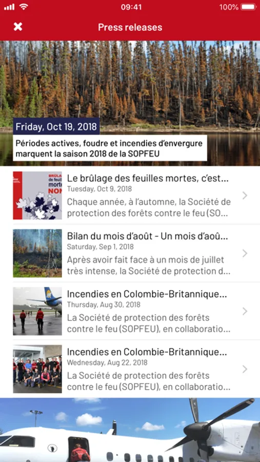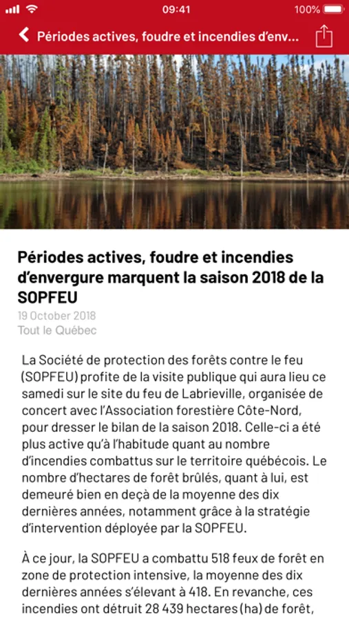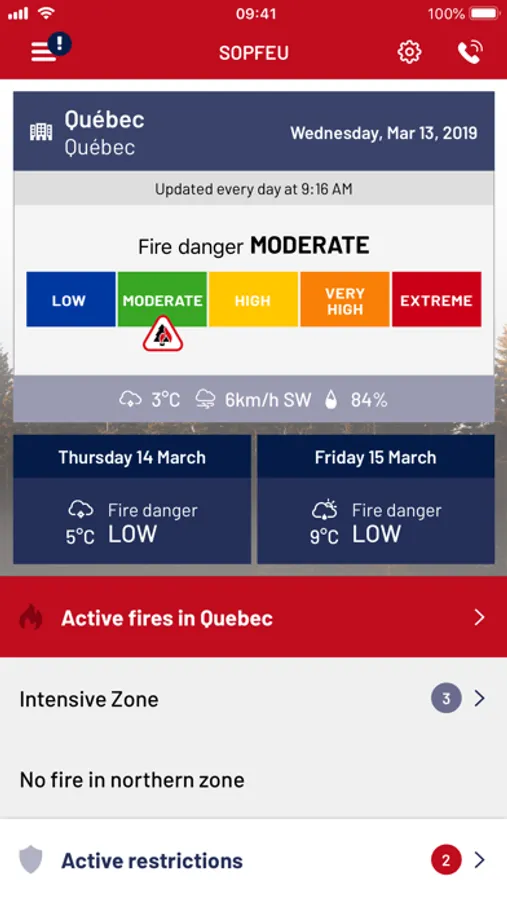 The SOPFEU app provides information on the active forest fires as well as preventive measures in force and fire hazards in your local area. User-friendly, it helps you to know the latest developments about active forest fire situation.