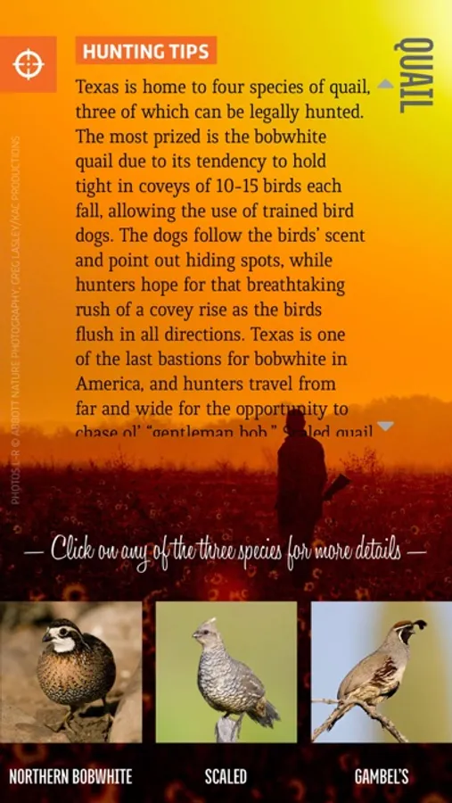 For iPad and iPhone with free bonus materials. Experience Texas Parks & Wildlife, the award-winning guide to the Texas outdoors packed with outstanding photos and articles about fishing, hunting, camping, birding, boating, traveling and more. Texas Parks & Wildlife brings you information about state parks, environmental issues and events taking places across Texas as we fulfill our mission—to manage and conserve the natural and cultural resources of Texas and to provide hunting, fishing and outdoor recreation opportunities for the use and enjoyment of present and future generations.