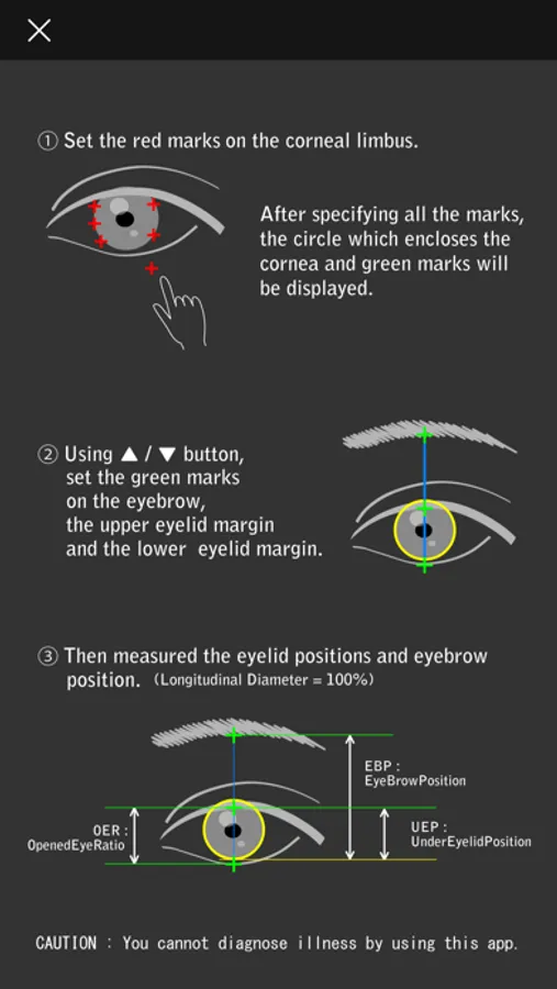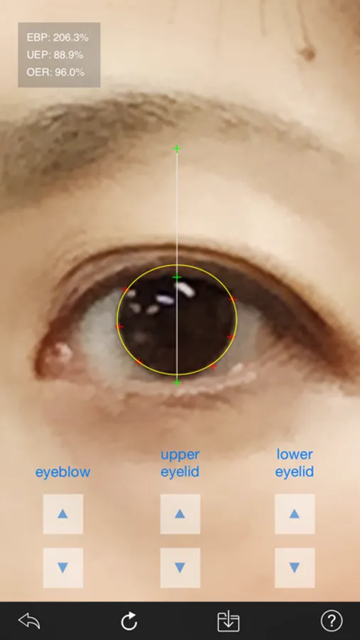 Step 4. Using ▲ / ▼ buttons, set the green marks on the eyebrow, the upper eyelid margin and the lower eyelid margin.
