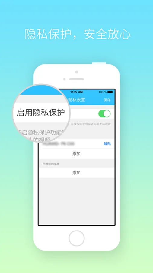 网络安全非常重要,清新微视现已支持隐私保护,启用以后,只有您的手机和经过授权的手机才可以观看音视频,即便密码被盗也无法观看,让您使用起来更加安全放心,免去后顾之忧。