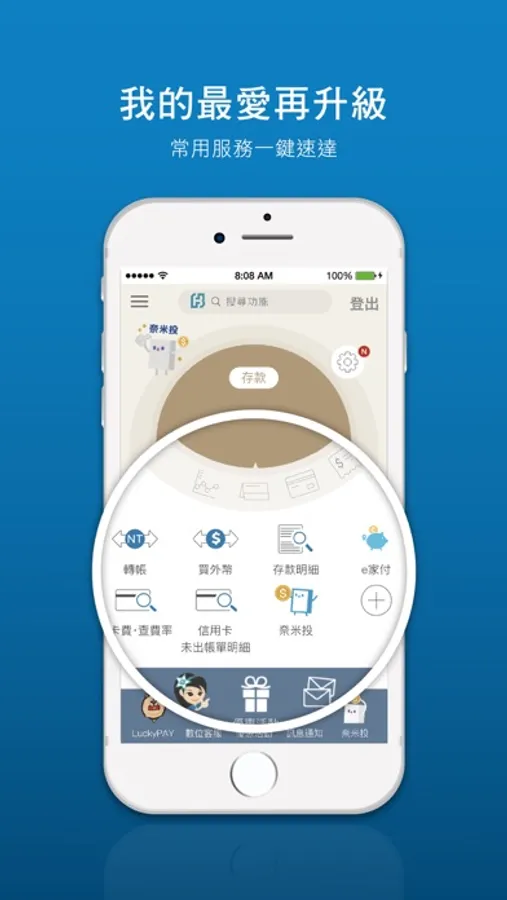 ◆桌面小工具/Widget:功能再進化,快速交易小技巧!提供秀匯率、換外幣、LuckyPAY、轉臺幣、讀明細、查卡款、理刷卡、看存款、觀基金、問邦妮等快速交易。