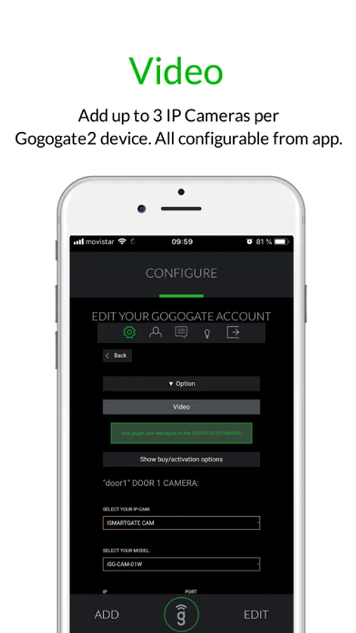 *Connect a IP camera to GogoGate2 to see what is happen in your garage (up to 3 cameras, one for each door)