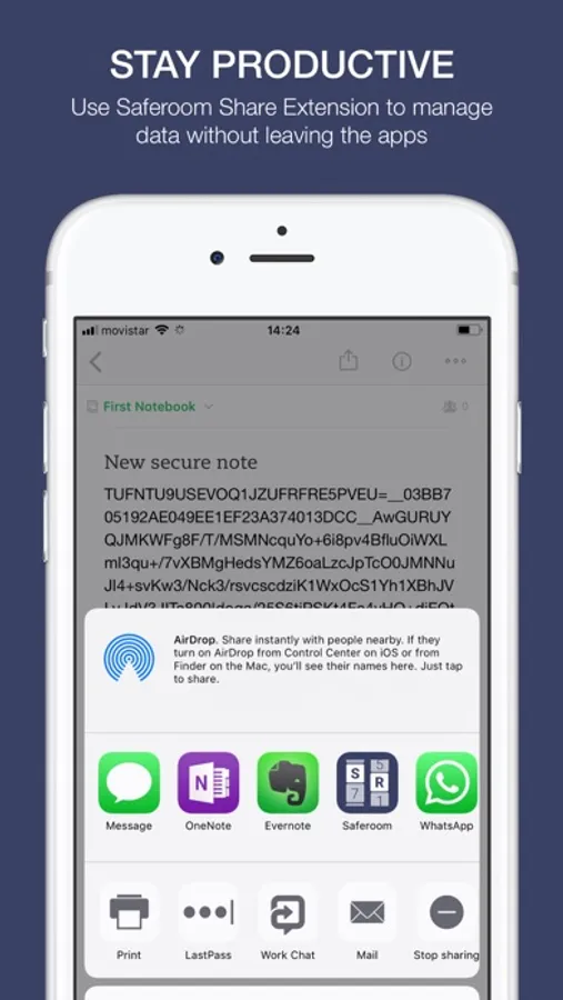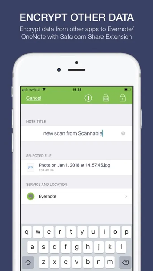 Additionally, with Saferoom Share extension you can decrypt your Evernote notes directly from the Evernote app. And more over, with Share extension you can encrypt data from other apps (like Scannable, Photos, etc.) directly to Evernote or OneNote.