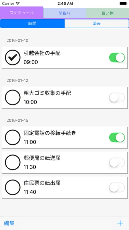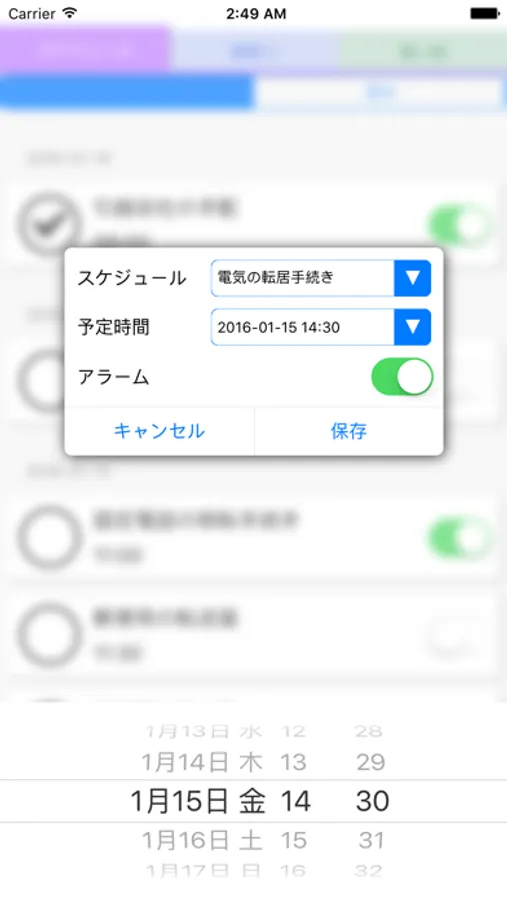 引越会社の手配、電気、ガス、水道契約の変更などスケジュールの登録、アラームができます。