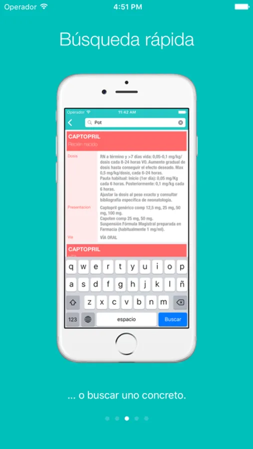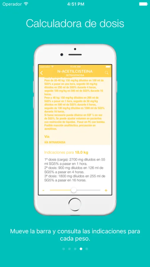 Pulsa la ficha del fármaco que quieras consultar y aparecerá la barra de pesos. Mueve la barra y busca el peso de tu paciente. DosisPedia te sugiere la dosis para ese peso. Además podrás consultar las indicaciones generales del fármaco: vía de administración, posología y presentación.