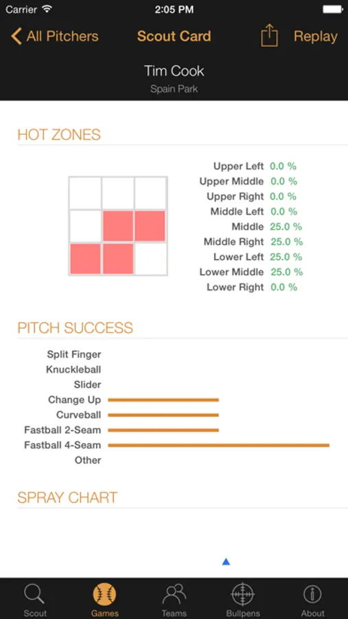 Each export will include a spray chart showing where balls were hit to throughout the game, as well as the outcome of each at-bat.