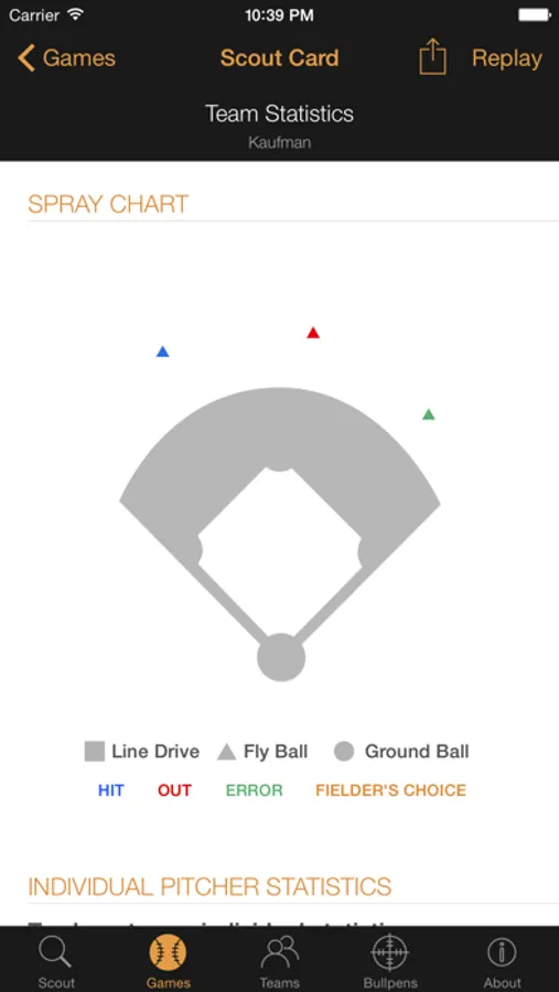 Along with the spray and stats, every at-bat, pitch count of every at-bat, as well as outcome of each at-bat is catalogued in the app and listed in the export.
