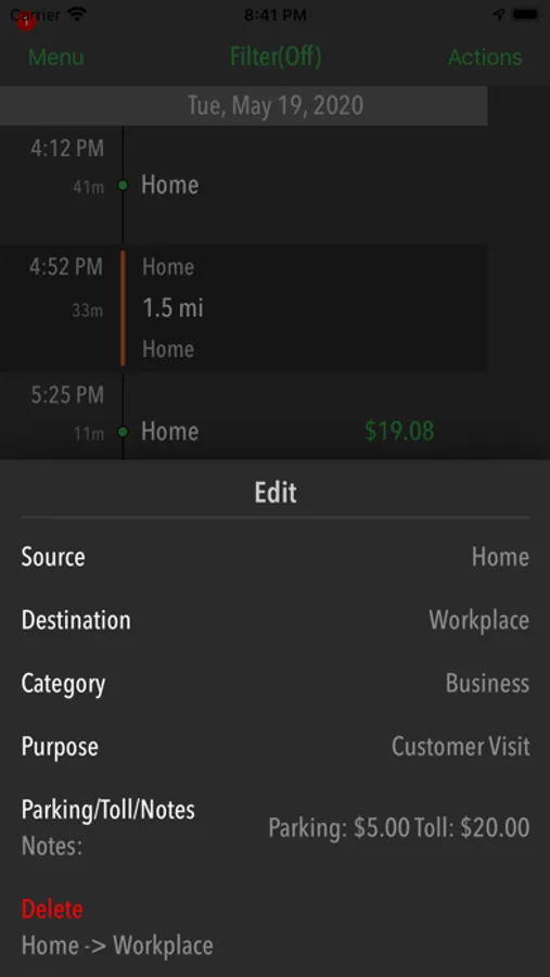 MileBot records every trip, route and stops you actually took. Your mile log is quite accurate, since distance is recorded from the actual route taken. Let us say you ended your business trip at a short stop and start your personal trip. Most apps will record it as a single trip. But MileBot allows you to split the trip into two at a stop and accurately record Personal and Business trips. MileBot also allows you to combine two adjacent trips into one. MileBot shows exact source and destination location in the map along with address.