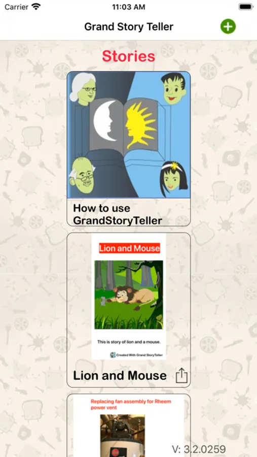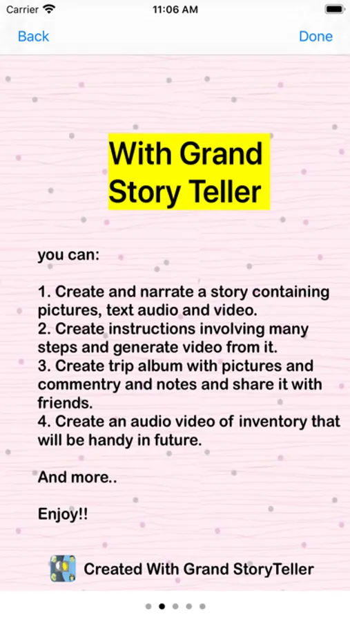 With Grand Story teller you can put together a story of your trip, adventure or instructions/steps for anything thatyou would like to share with others. Story consists of various pages of images, text, audio and video withbackground of your choice for each page. You can prepare a slide presentation, memory book and many otherthings with Grand Story Teller. Grand Parents, You can personalized audio book of any story with your voice so yourgrand kids can enjoy them in your own voice. You can sing to lyrics of a song. Created story can be converted to video to be shared or saved in camera roll or put on YouTube.