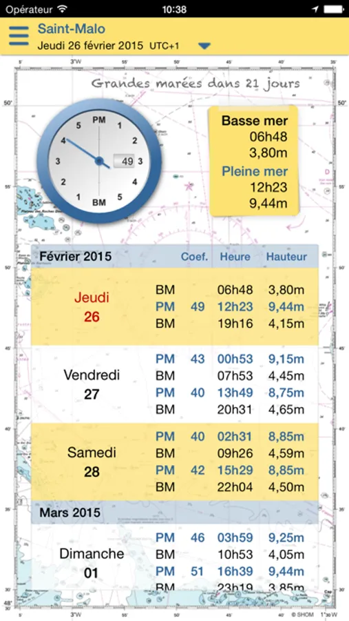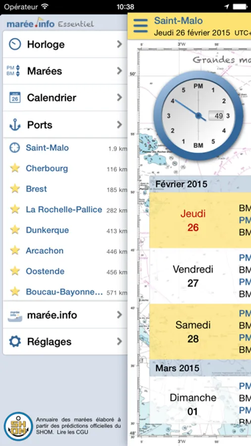 Il permet de passer d'un port à l'autre et de gérer vos favoris. Une horloge sur chaque port permet un rapide coup d'oeil sur l'état de la marée.