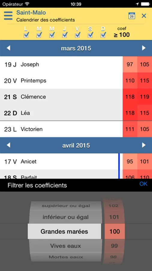 Coefficients, fêtes, jours fériés. La "loupe" active la recherche par critères. Ex: les grandes marées (coef >=100) pour samedi et dimanche.