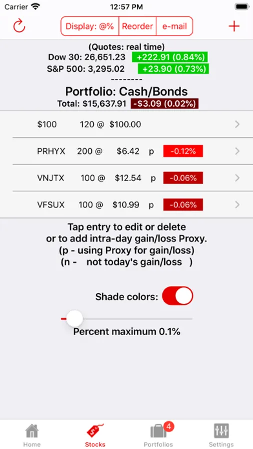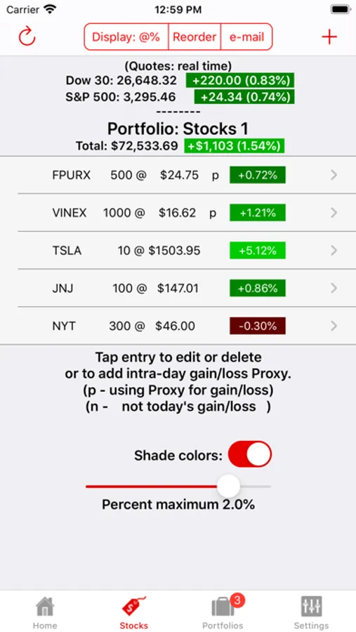Watch My Stock downloads current stock quotes and displays the value and intra-day gain/loss of any number of shares of up to 40 stocks in a portfolio along with the total portfolio value and daily gain/loss. Store up to 8 different stock portfolios. Use a proxy stock or ETF to track the daily gain/loss for funds that do not trade during the day (e.g. use SPY to track FSMVX so you see today's gain not yesterday's loss). Each stock, and the total portfolio, can be displayed in a color shade corresponding to the percentage daily gain/loss from bright green through black to bright red.