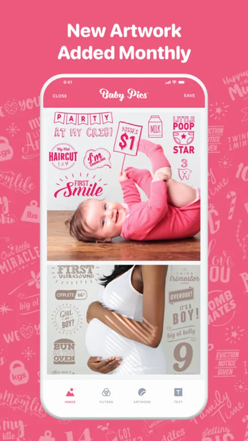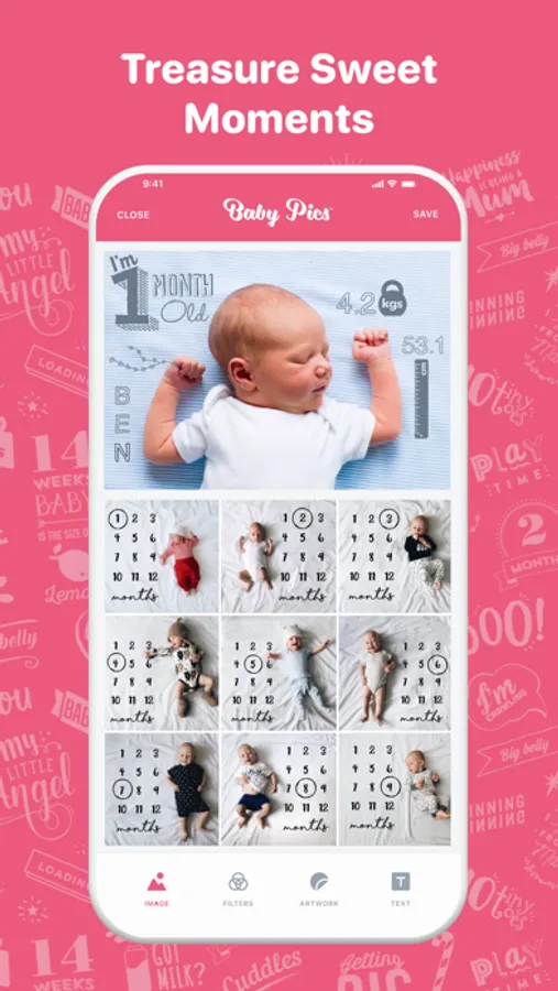 Parents-to-be & new parents, Baby Pics app is made for you! Capture precious pregnancy & baby milestone photos by marking them with beautifully crafted artwork & personalized text. Share & treasure forever! Capture your baby bump growth week by week, first kick, first smile, first steps, messy moments or first day at school. Add adorable artwork & treasure the special moment forever.