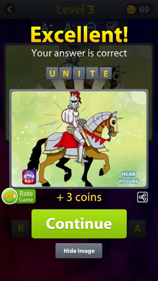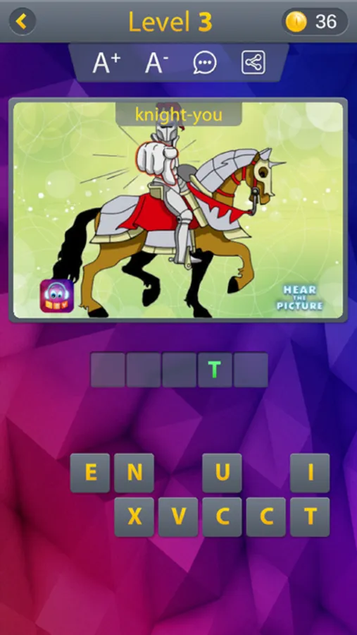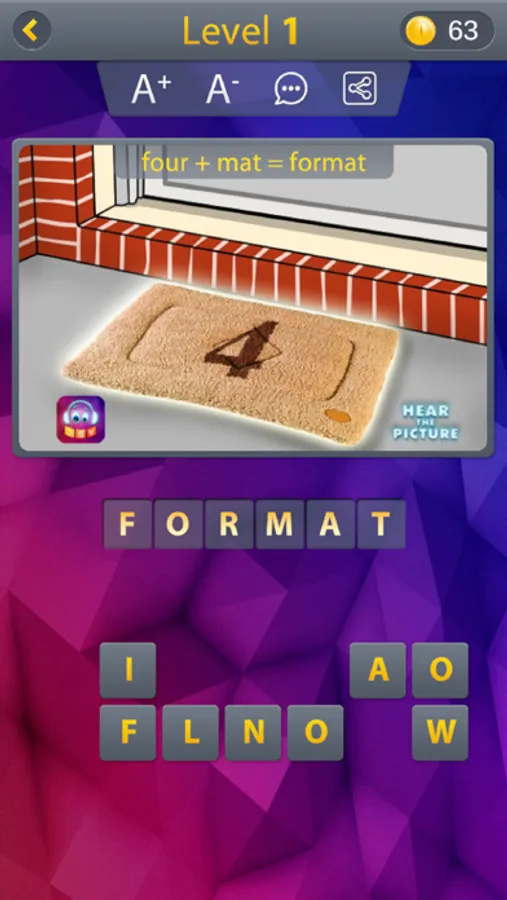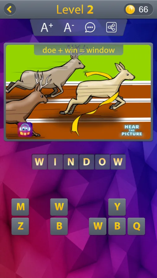 In this word game, each level has 1 picture, you have to find out 2 words that the picture illustrated, then combined their sounds and make another defined word in English, almost not related to what the picture illustrated.