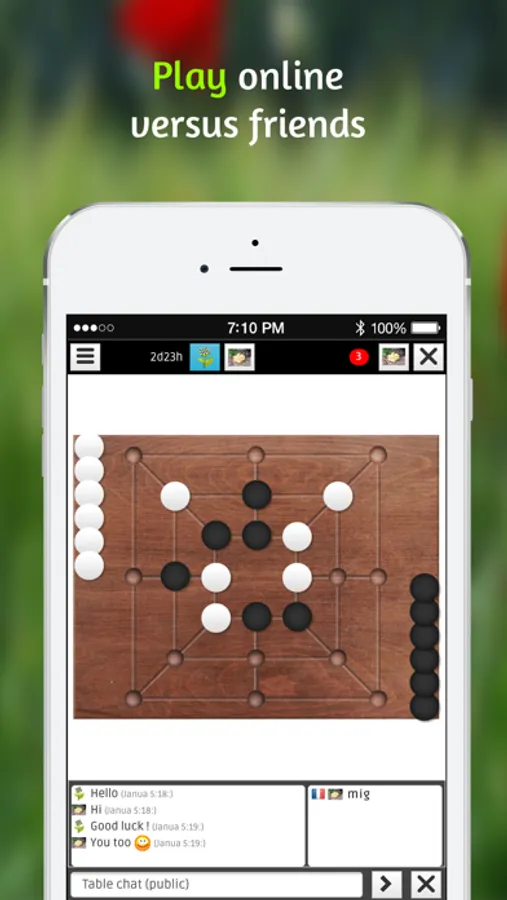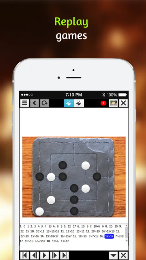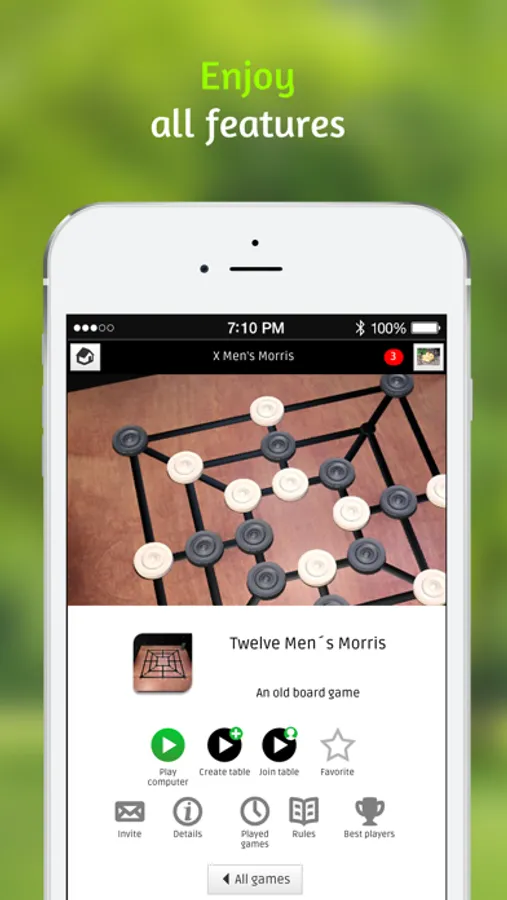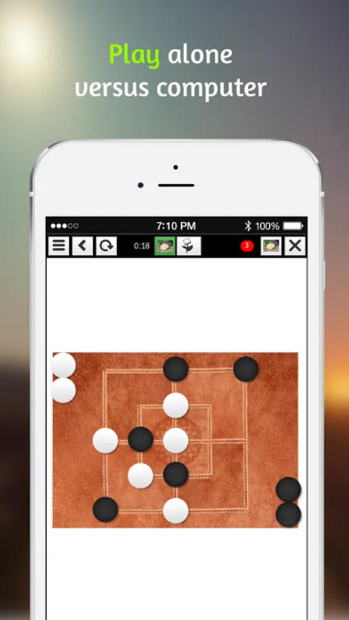 The application packages 9 Men's Morris, 12 Men's Morris, 3 Men's Morris, 6 Men's Morris and 7 Men's Morris. The 9 and 12 versions also include an optional rule to "fly" ay the end of the game.