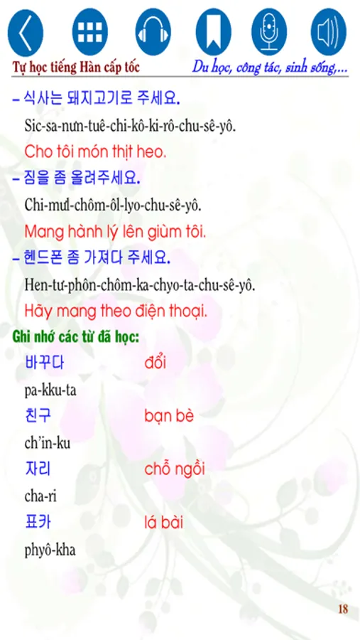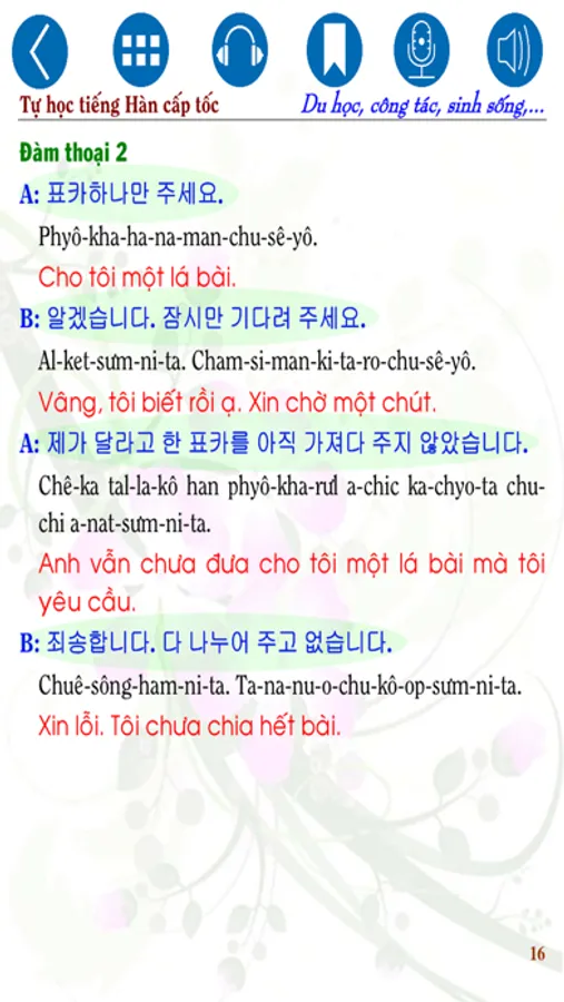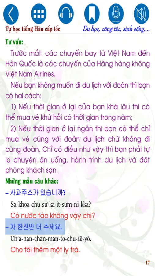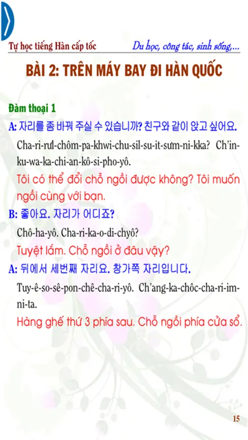Quyển sách “(Tự học tiếng Hàn cấp tốc – Công tác, du học, sinh sống tại Hàn Quốc (Korean for Studing Abroad))” gồm 204 trang được thực hiện theo tiêu chí phiên âm theo cách đọc của người Việt và dùng để “Học tiếng Hàn mọi lúc mọi nơi” khi trong tay có chiếc điện thoại thông minh. Trong quá trình biên soạn không khó tránh khỏi những sai sót ngoài mong muốn, hy vọng sự đóng góp quý báu từ các bạn giúp quyển sách ngày càng hoàn chỉnh hơn. Xin chân thành cảm ơn và chúc các bạn học tập hiệu quả! Những tiện ích khi bạn sử dụng Sách Thông Minh - SmartBooks của chúng tôi: Sách được tích hợp âm thanh (audio) vào trong sách, đánh dấu từng câu khi đọc, khi cần nghe lại câu vừa mới đọc hay câu nào đó thì bạn chỉ cần chạm tay vào câu đó thì sẽ phát âm thanh; Ngoài ra SmartBooks còn có tính năng thu lại giọng đọc (giọng của bạn tập đọc câu vừa học, vừa nghe) của bạn bằng cách nhấn vào nút Recorder (icon Micro), khi bạn nhấn vào icon “Headphone” “Nghe và viết”, xuất hiện màn hình có rất nhiều tính năng giúp bạn nghe và viết lại câu vừa nghe bằng phím hay bằng tay,… Sách được thiết kế để sử dụng mọi lúc mọi nơi khi trong tay bạn có chiếc Smart Phone. Đây là một bước đột phá của chúng tôi trong thời đại công nghệ số nó sẽ giúp các bạn rất nhiều trong việc học và đọc sách.