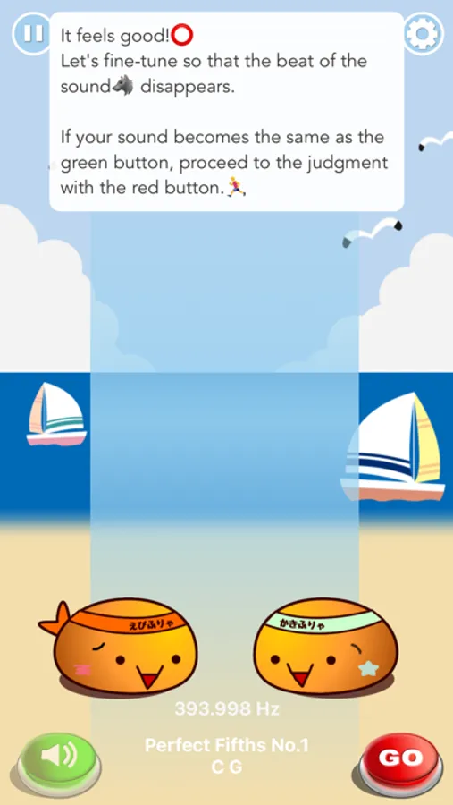 In this app, two sounds are played at the same time, but the decision is calculated on the basis of just intonation.