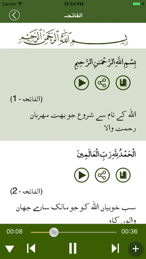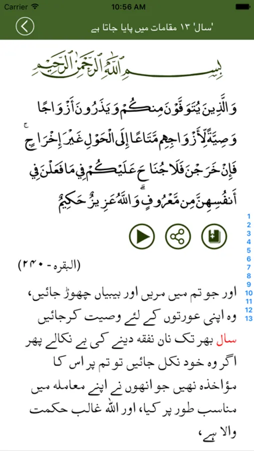 With this Islamic book app, you are getting Hafizi quran with real page-curl experience. This is not just a textual app, it is an audio Quran app. You can listen telwat of Quran ayats continuously (internet connection required). You can search words or topic in Urdu on this Quran app. Bookmark the ayat / verse you like / quote. Share the ayat / verse you want.