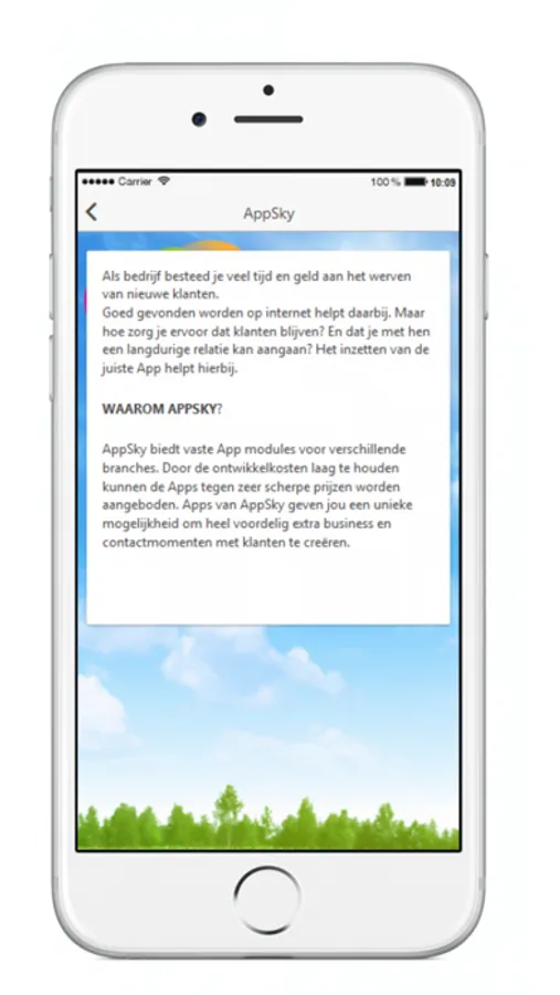 AppSky biedt vaste App modules voor verschillende branches. Door de ontwikkelkosten laag te houden kunnen de Apps tegen zeer scherpe prijzen worden aangeboden. Apps van AppSky geven jou een unieke mogelijkheid om heel voordelig extra business en contactmomenten met klanten te creëren.