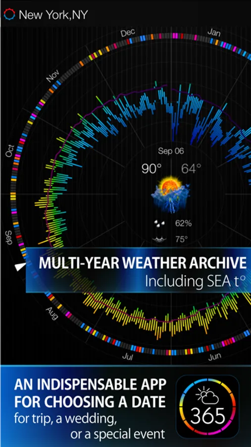 Weather 365 days provides instant access to archive of global historical weather, climate data and sea-surface temperatures. Using original visualization the app provides all important weather-data at a glance - sun, clouds, rain, snow, local weather extremes and records, holiday weather, day/night temperatures, sky conditions, probability of precipitations and temperature of water.