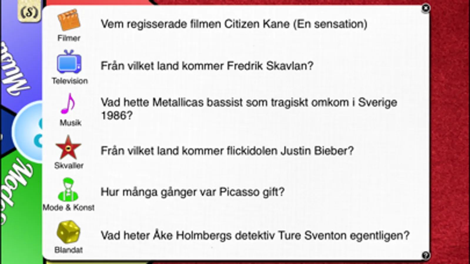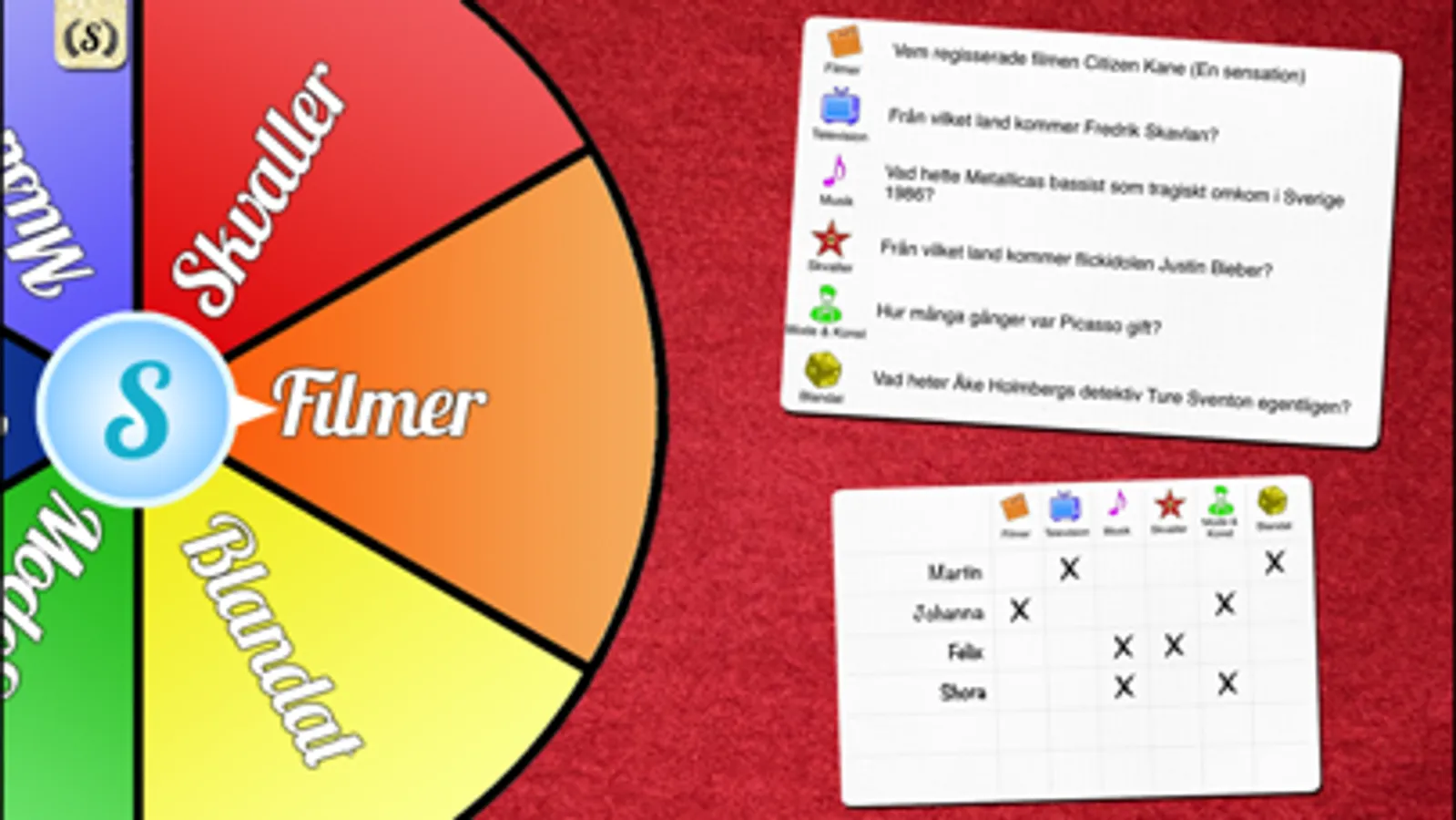 * Frågehjul med sex kategorier (Samhälle, Sport/Fritid, Nöje/Kultur, Historia, Geografi, Vetenskap)