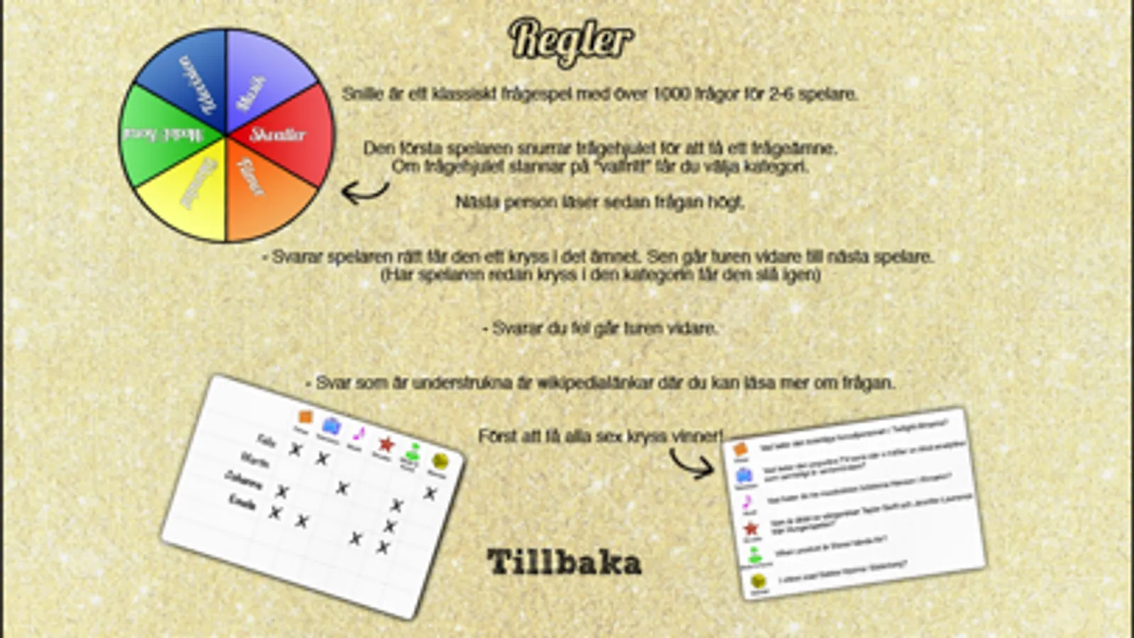 SNILLE 2 är gjort för 2-6 spelare. Styr spelet själv, och turas om att läsa frågor för varandra. Snurra hjulet, dra med fingret för att vända på frågekortet och sätt själva poängkryss på poängkortet. Dela dina segrar på Twitter och Facebook!