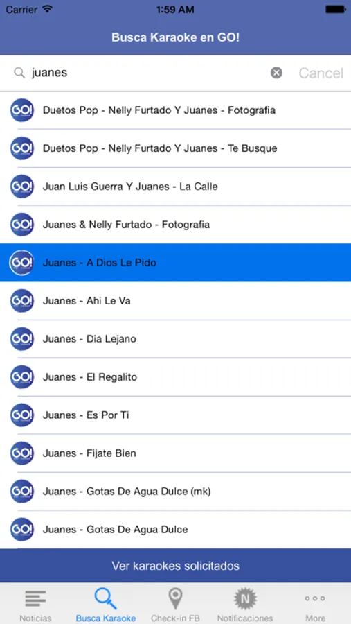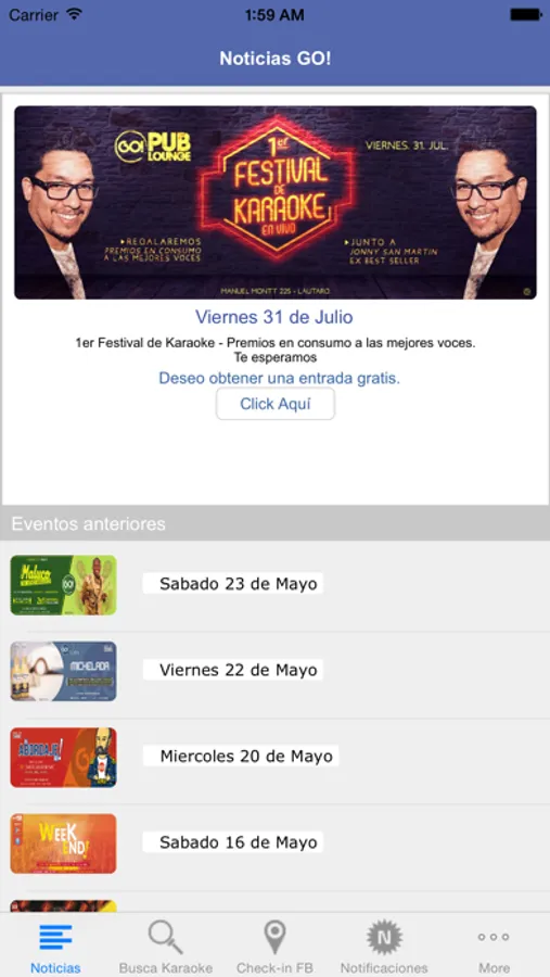 Aplicación para Información y búsqueda de karaoke de GO! Pub de Lautaro. Podrás enterarte de todos los eventos y participar en concursos disponibles para cada fin de semana.