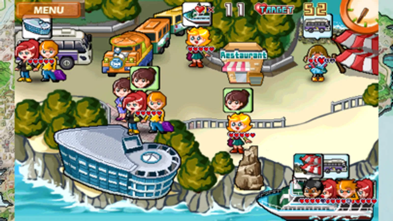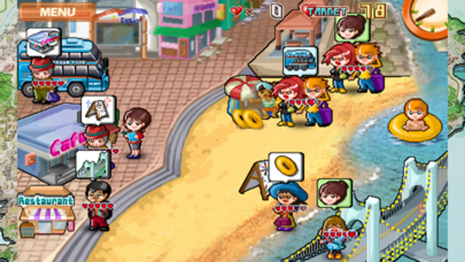 - To complete a level, reach the target hearts total before the day is over.