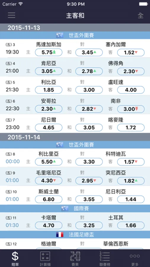 - 表列模式顯示各類賠率(主客和,入球大細,讓球,角球...等)及賠率趨勢圖示