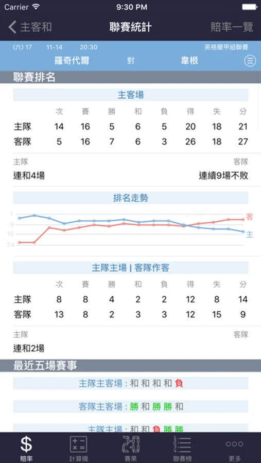 - 個別賽事聯賽統計:以圖表形式表達主客隊賽季表現,包括排名走勢,最近五場結果,入球大細,總入球及其他相關數據,更設有數據備忘,幫助球迷分析賽事