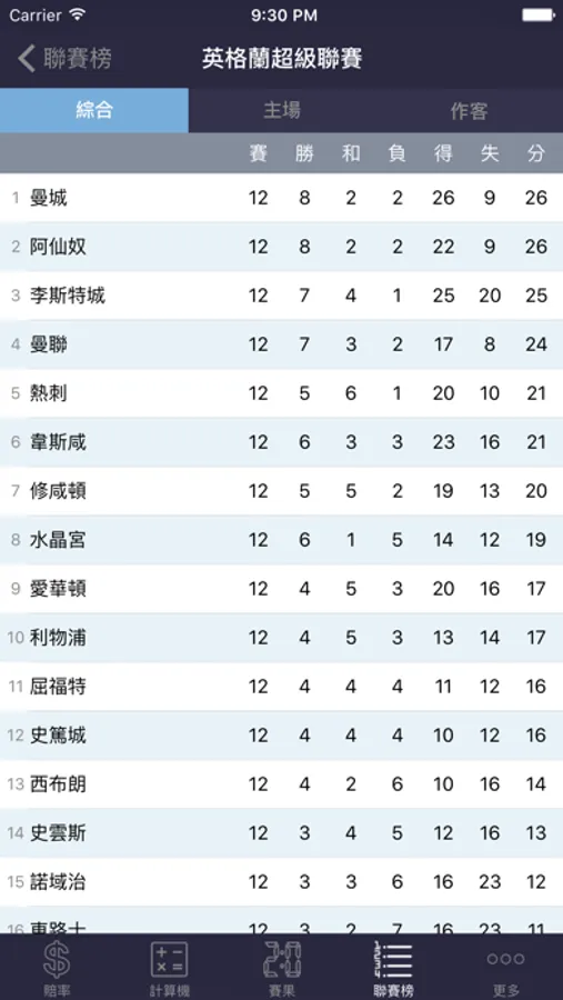 - 最新聯賽(總場次,主場,客場)積分榜,