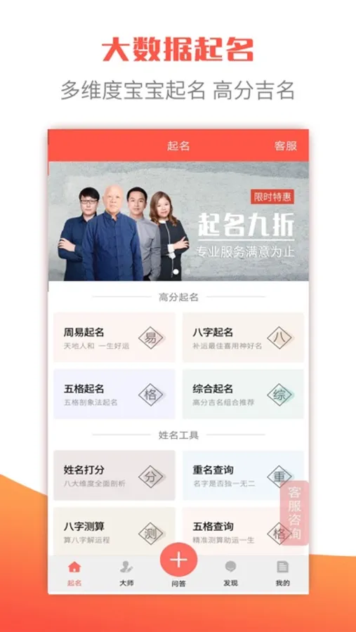 3. 多样起名工具:周易起名,八字起名,五格起名,综合起名,姓名打分,重名查询,八字测算,五格查询,天降吉名,称骨论命,三世财运,小名起名,英文起名,双胞胎起名,四字名起名。让你的名字不输名人明星,响亮大气。