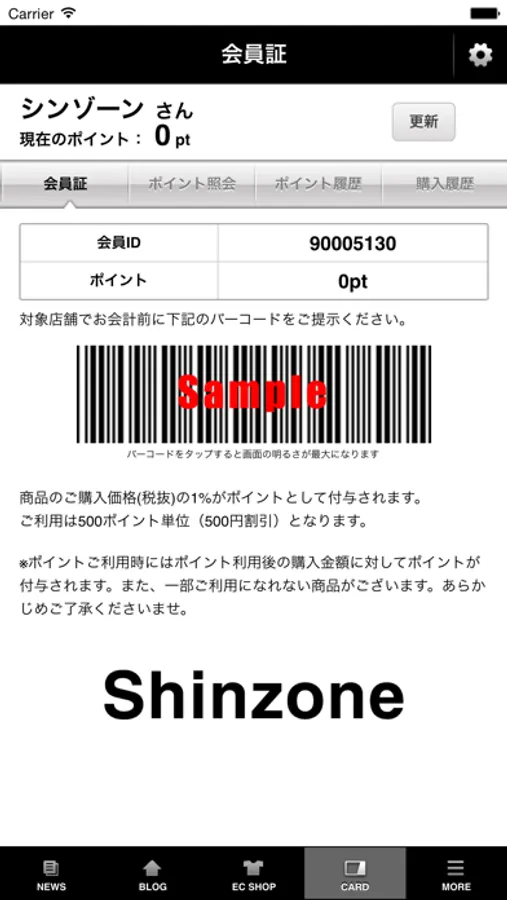 「Shinzone」アプリは、株式会社シンゾーンの対象店舗にて会員証としてご利用いただけます。
