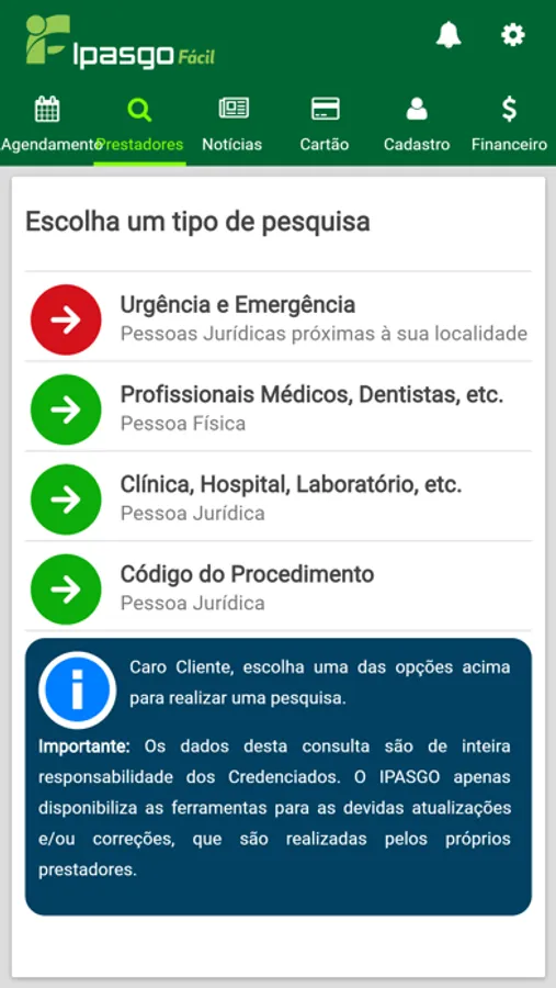 - Mostra informações dos prestadores como horários de atendimento, telefones de contato, endereços de atendimento, site etc.;