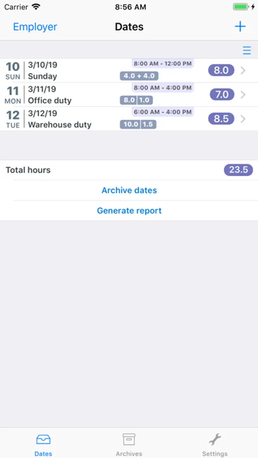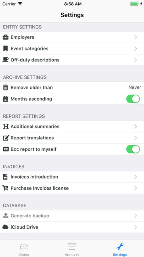 Employers support many individual settings and automatic report generation is supported in either inline HTML or PDF file. Reports are exported by utilising iOS's own Mail. PDF files also support pagination.