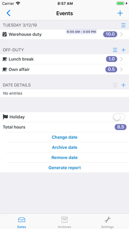 Event entries also may contain additional information. I have created this to suit most worker's needs based on real life experiences, yet keeping the application simple, so using HourTracker, markings can be made pretty quickly and won't become a burden. You can add multiple event categories, like "work time" and "other work" for example. HourTracker, like the name says, does not support minute precision, shortest supported precision is 15 minutes.
