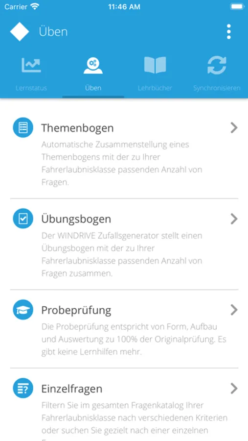 Mit dem WINDRIVE Therorietrainer bereiten Sie sich effektiv und sicher auf die theoretische Führerscheinprüfung vor. Die App beinhaltet immer den aktuellen offiziellen Prüfungsfragenkatalog der „TÜV | DEKRA arge tp 21“ und ist ein Lernprogramm für alle Führerscheinklassen.