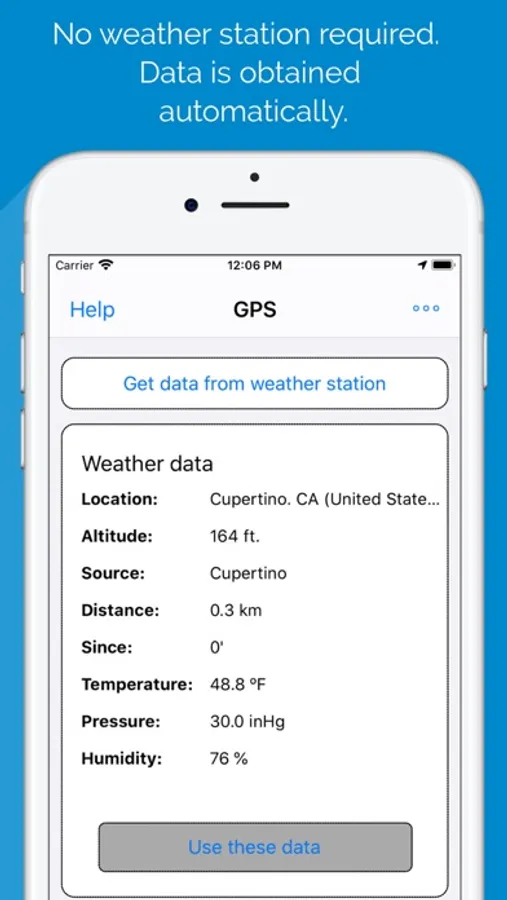 In order to get the weather values, the application can use the GPS to obtain the position and altitude, and the network connection to get the temperature, pressure and humidity from the nearest weather station. Nevertheless, the application can run without GPS and internet connection, in this case, the user has to give the altitude and weather data.