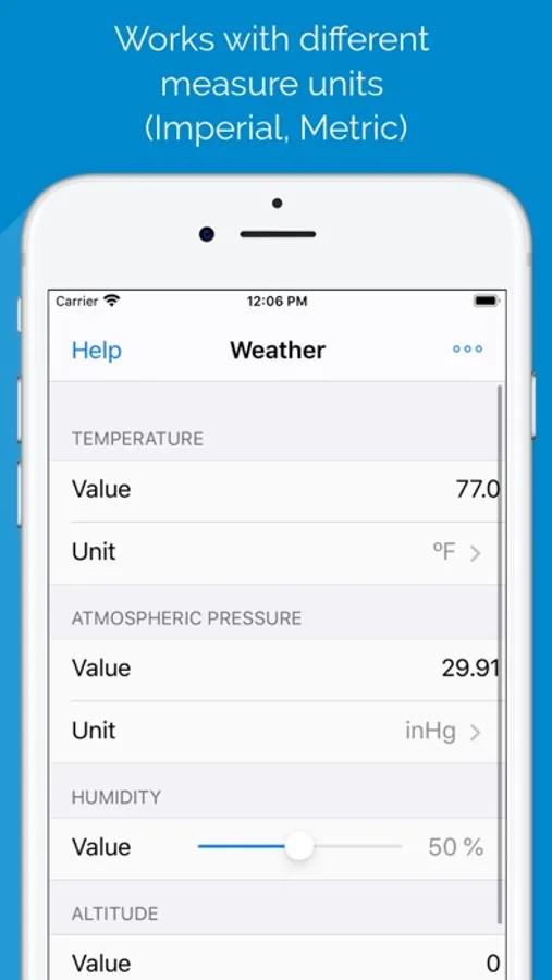 The application can manage different measure units: meters and feet for altitude, ºC and ºF for temperatures, mb, hPa, inHg, mmHg for pressure.