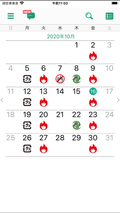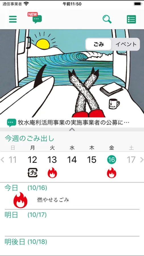 今日と明日、週ごと、月ごとの3パターンによるごみ収集日程を一つの画面ですぐに確認することができます。