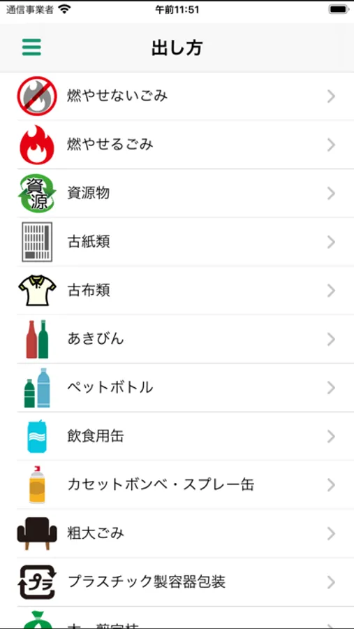 ごみの種別ごとに、主な品目と出し方を確認することができます。