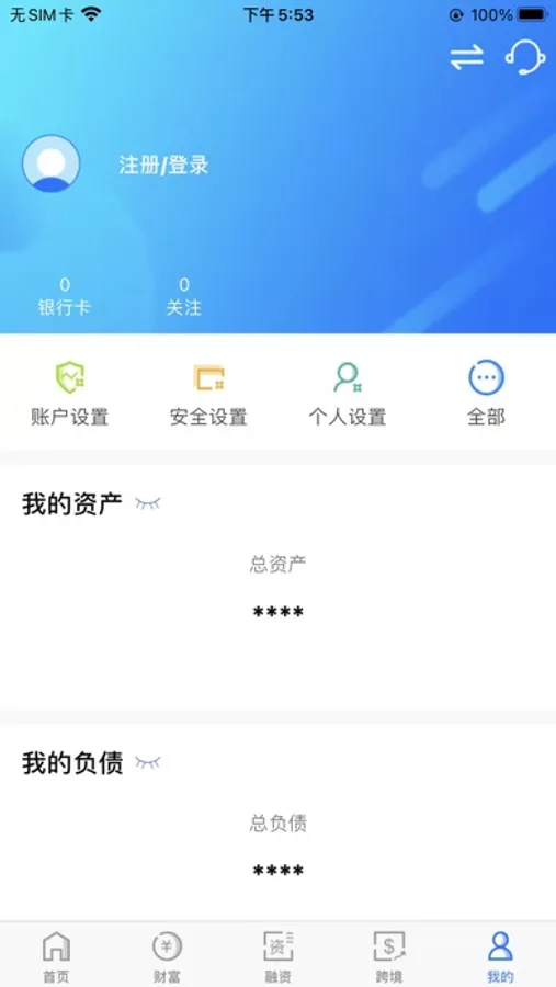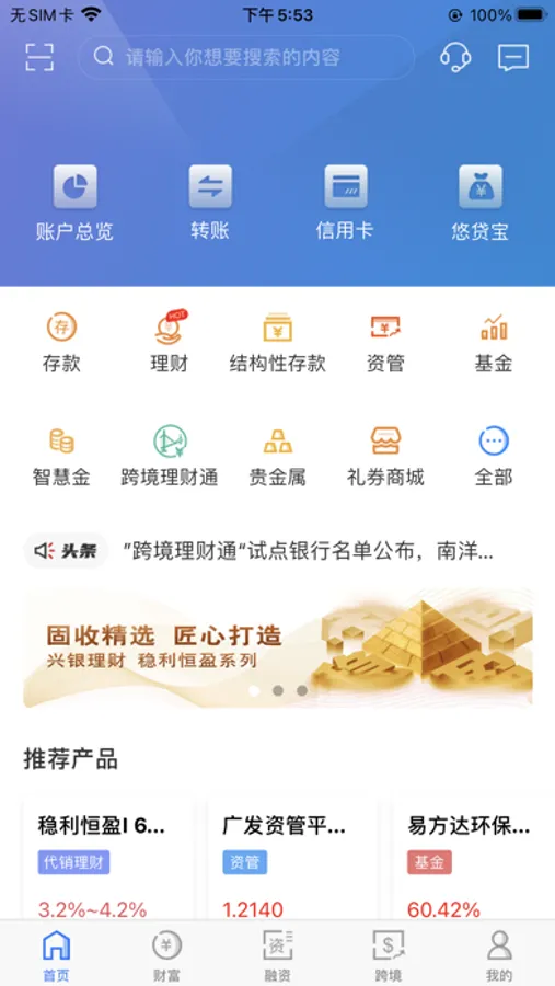 【暖心的设计风格】“首页”、“财富”、“融资”、“跨境”、“我的”五大模块闪亮登场,知您所想的展示栏位,及您所及的助手服务,为您打开掌上新“视”界,感受不一样的金融体验。
