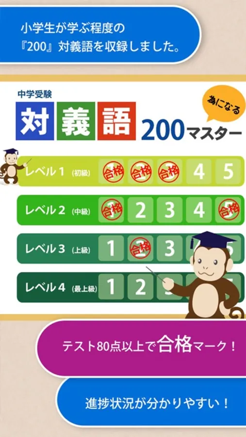 ・練習とテストの二つのセクションをクリアすることで、対義語を広く学ぶことができます。