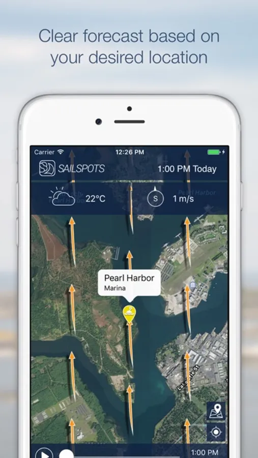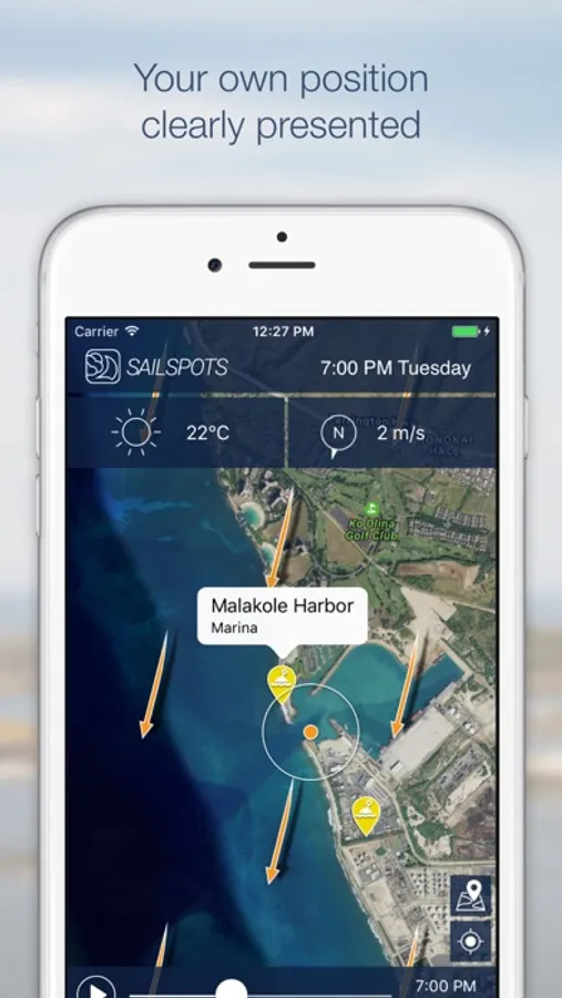 With Sailspots you get a detailed weather and wind forecast presented in a clear and intuitive way on top of your desired location on map.
